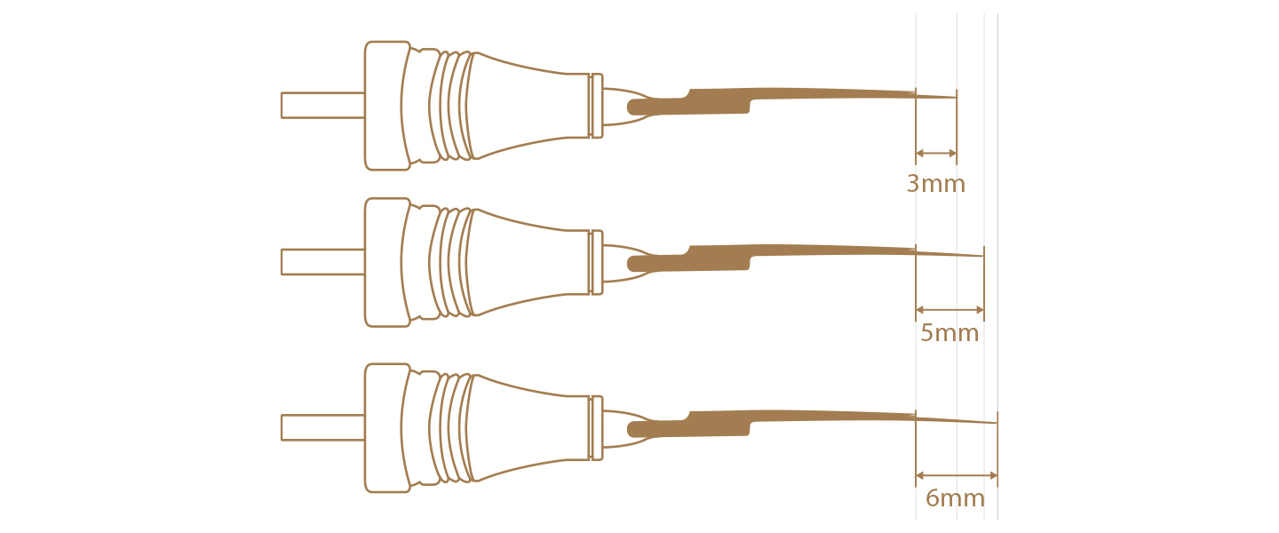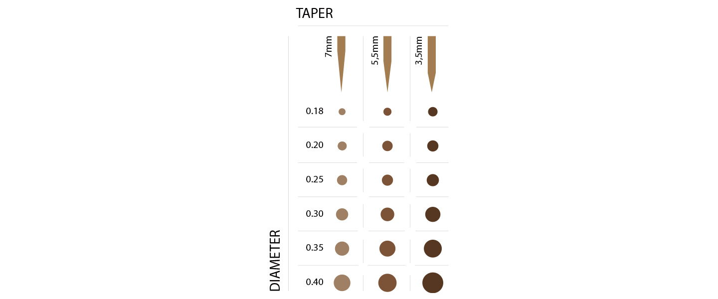 Les diamètres d'aiguille supérieurs à 0,25/0,30/0,35 mm sont destinés à être utilisés sur tous les types de peau et sont de taille universelle pour toutes les techniques de PMU. Ils contribuent à réduire les traumatismes cutanés, ce qui les rend plus adaptés aux artistes débutants.