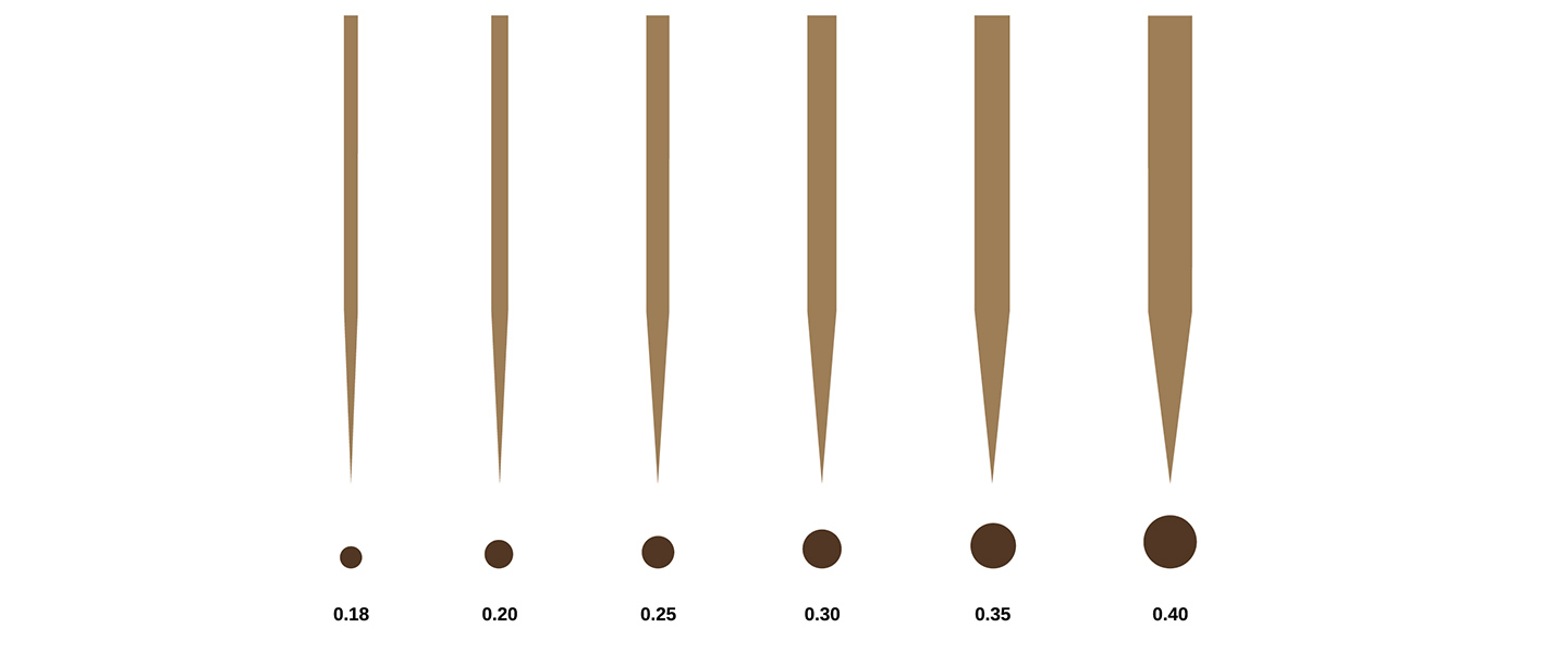 Les diamètres d'aiguille les plus couramment utilisés dans l'industrie du PMU sont de 0,18/0,20/0,25 mm, ce qui fait référence à des aiguilles très fines et flexibles. Ces tailles ne sont recommandées que pour les artistes expérimentés afin d'obtenir des détails précis.