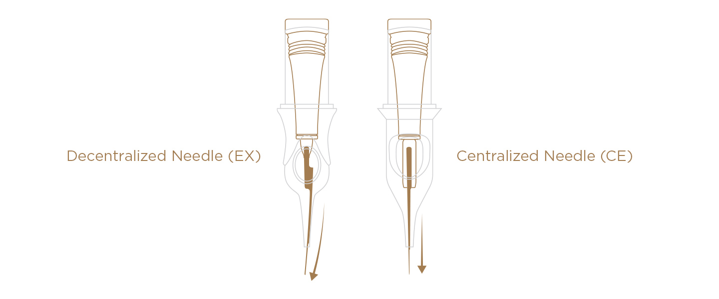 Une aiguille décentralisée est une caractéristique unique des cartouches Phi, ce qui signifie que l'aiguille elle-même est plus flexible et est préférable lors de travaux à des vitesses plus lentes et de mouvements manuels plus lents.