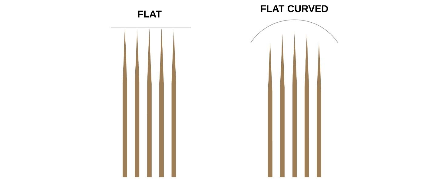 - Les aiguilles plates sont regroupées pour former une ligne droite. Les aiguilles plates peuvent être regroupées en fonction de leur pointe en une configuration plate ou courbée.